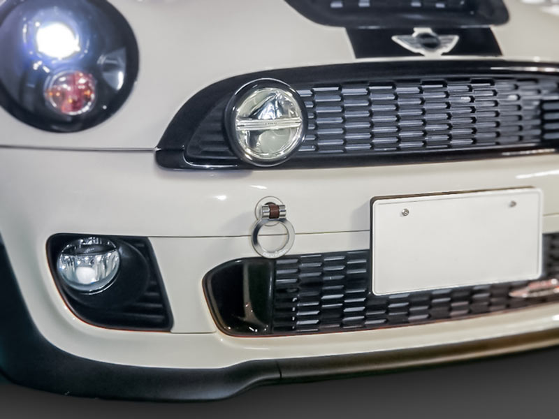 純正の牽引フック取付け穴へ装着するタイプのスチール製 首振りトーイングフック。レーシーな雰囲気を演出するドレスアップアイテムとしても有効です。