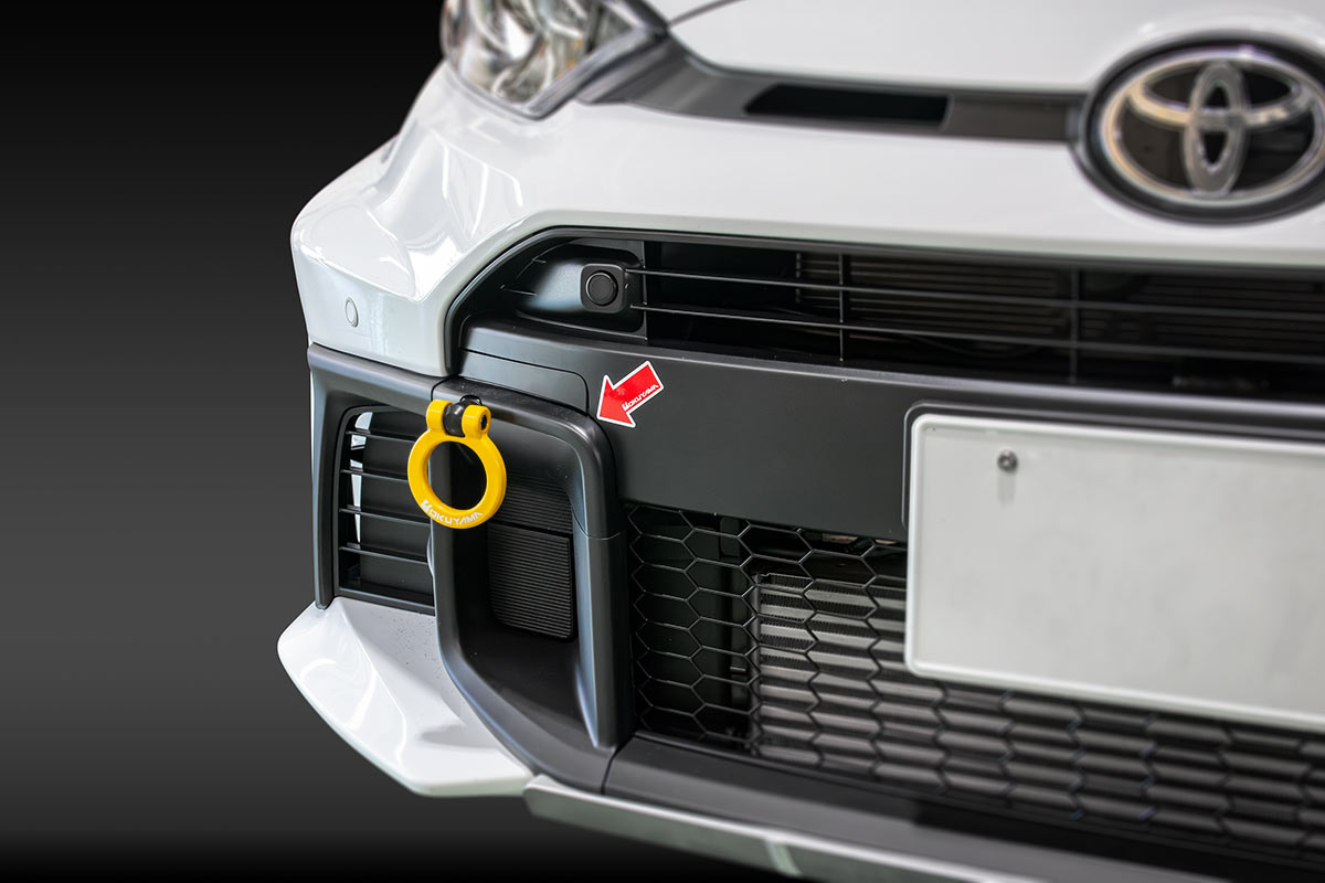 純正の牽引フック取付け穴へ装着するタイプのスチール製 首振りトーイングフック。折り曲げることで装着したままでも公道走行が可能です。