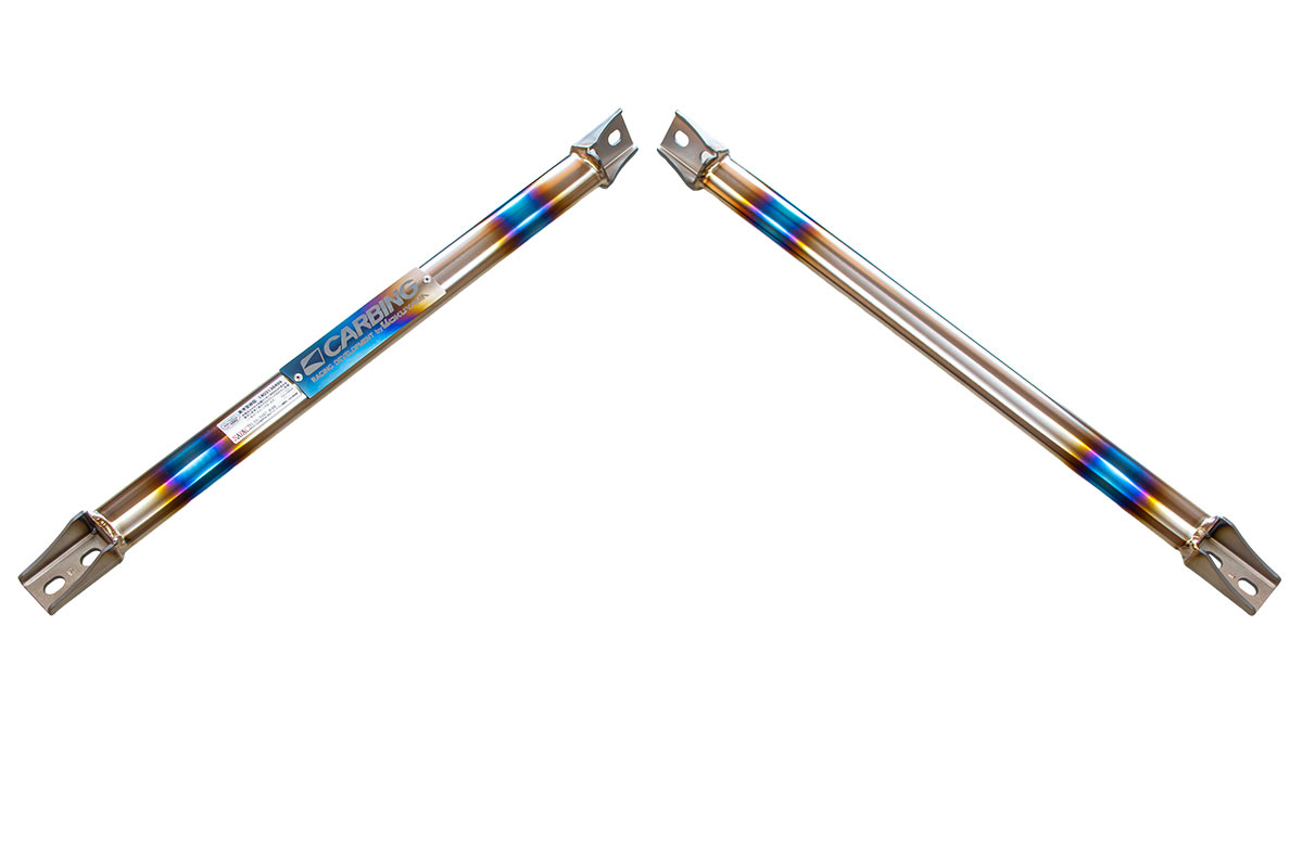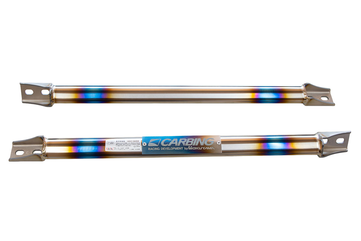 ・フロントのストラットアッパー左右とバルクヘッド中央を2本で結び、フロントオーバーハングの剛性を高め、 ステアリングレスポンス向上、ブレーキング時の安定性を向上させます。 『ストラットタワーバー フロント』と『フレームブレース フロント アッパー』は同時装着が可能です。同時装着をすることにより3点支持のトライアングル形状を形成し、さらにしっかりとした剛性感を得る事ができます。