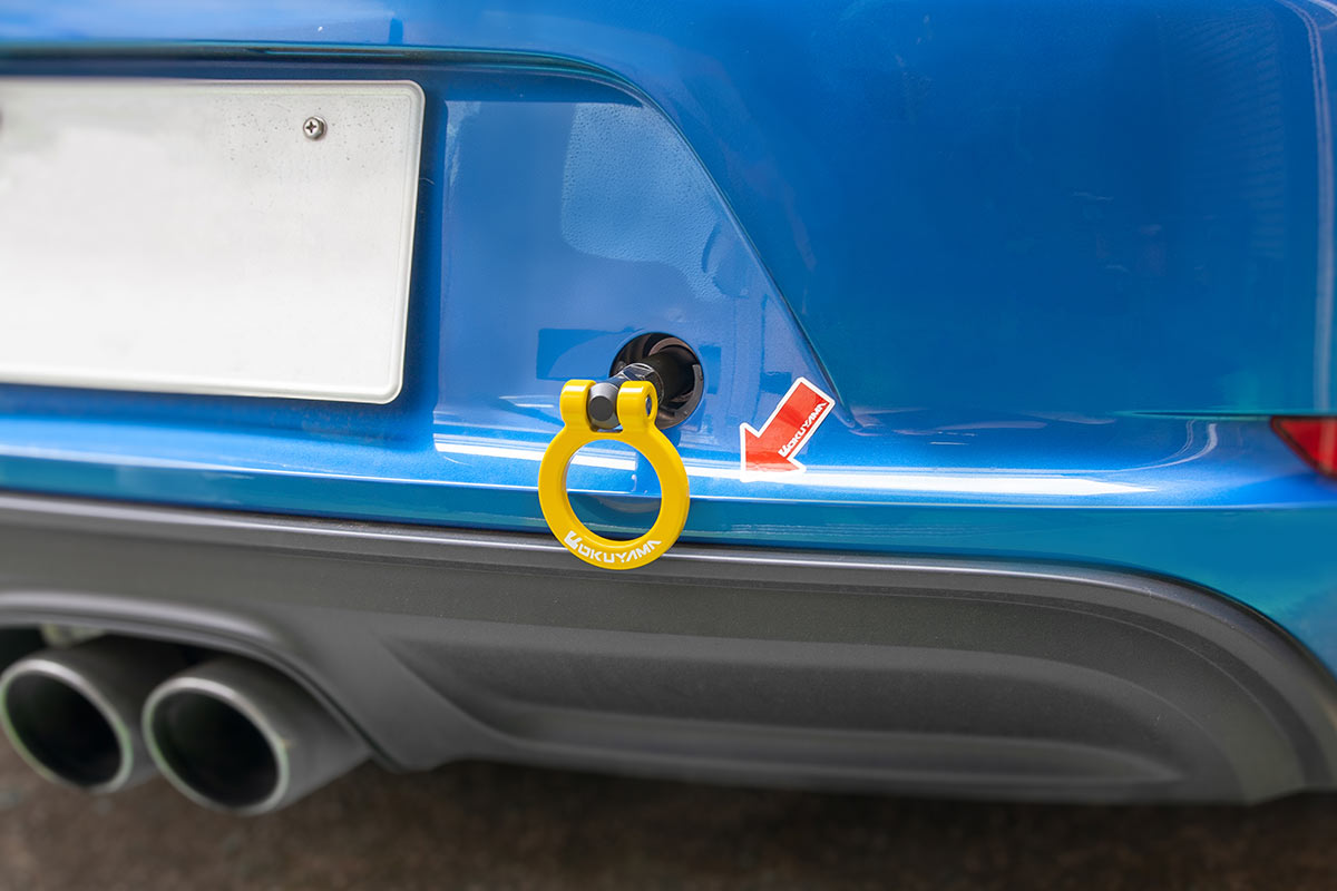 純正の牽引フック取付け穴へ装着するタイプのスチール製 首振りトーイングフック。折り曲げることで装着したままでも公道走行が可能です。