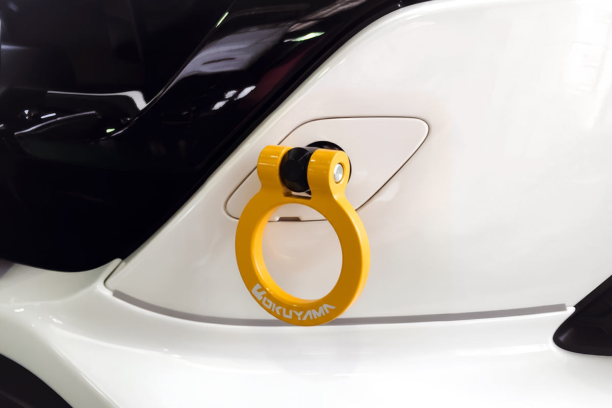 純正の牽引フック取付け穴へ装着するタイプのスチール製 首振りトーイングフック。折り曲げることで装着したままでも公道走行が可能です。