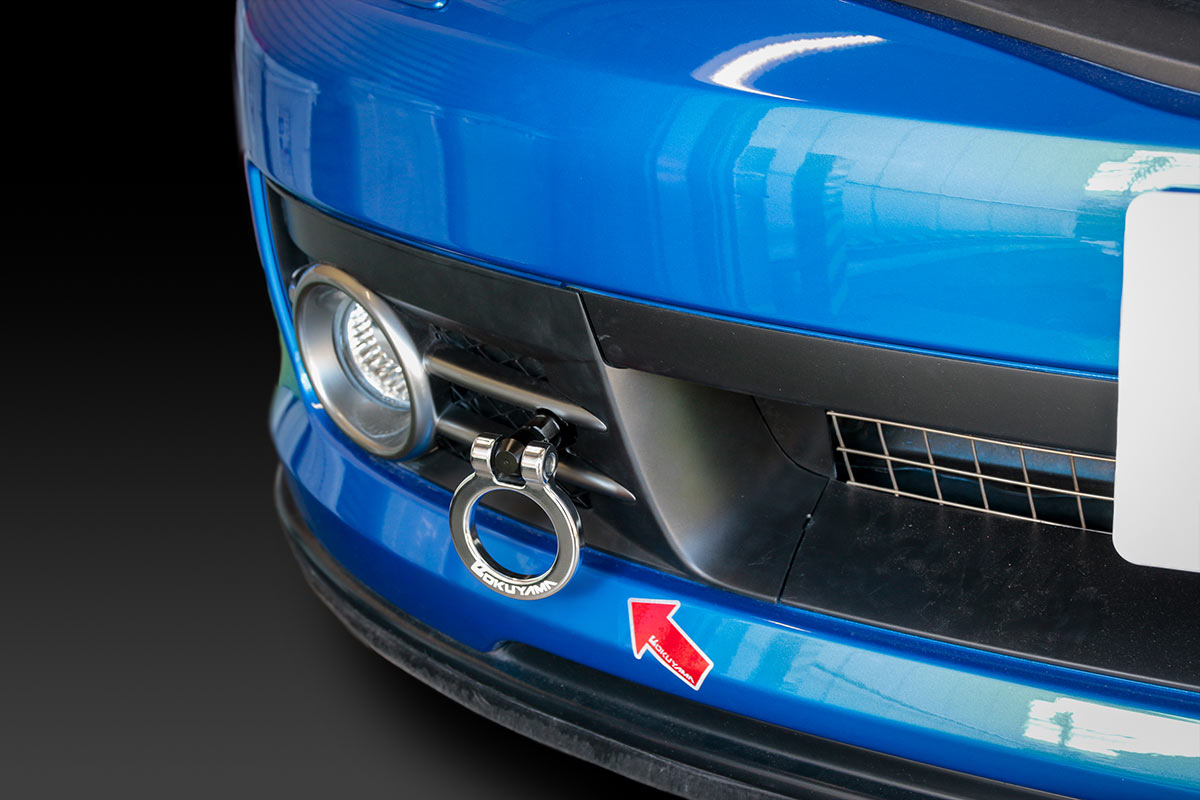 純正の牽引フック取付け穴へ装着するタイプのスチール製 首振りトーイングフック。折り曲げることで装着したままでも公道走行が可能です。