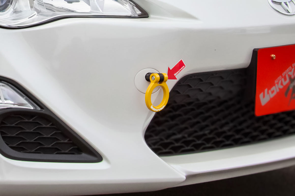 純正の牽引フック取付け穴へ装着するタイプのスチール製 首振りトーイングフック。折り曲げることで装着したままでも公道走行が可能です。