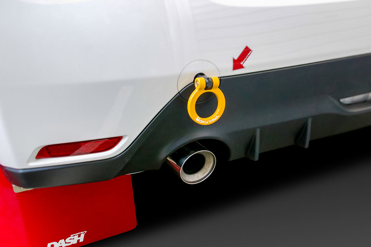 純正の牽引フック取付け穴へ装着するタイプのスチール製 首振りトーイングフック。折り曲げることで装着したままでも公道走行が可能です。