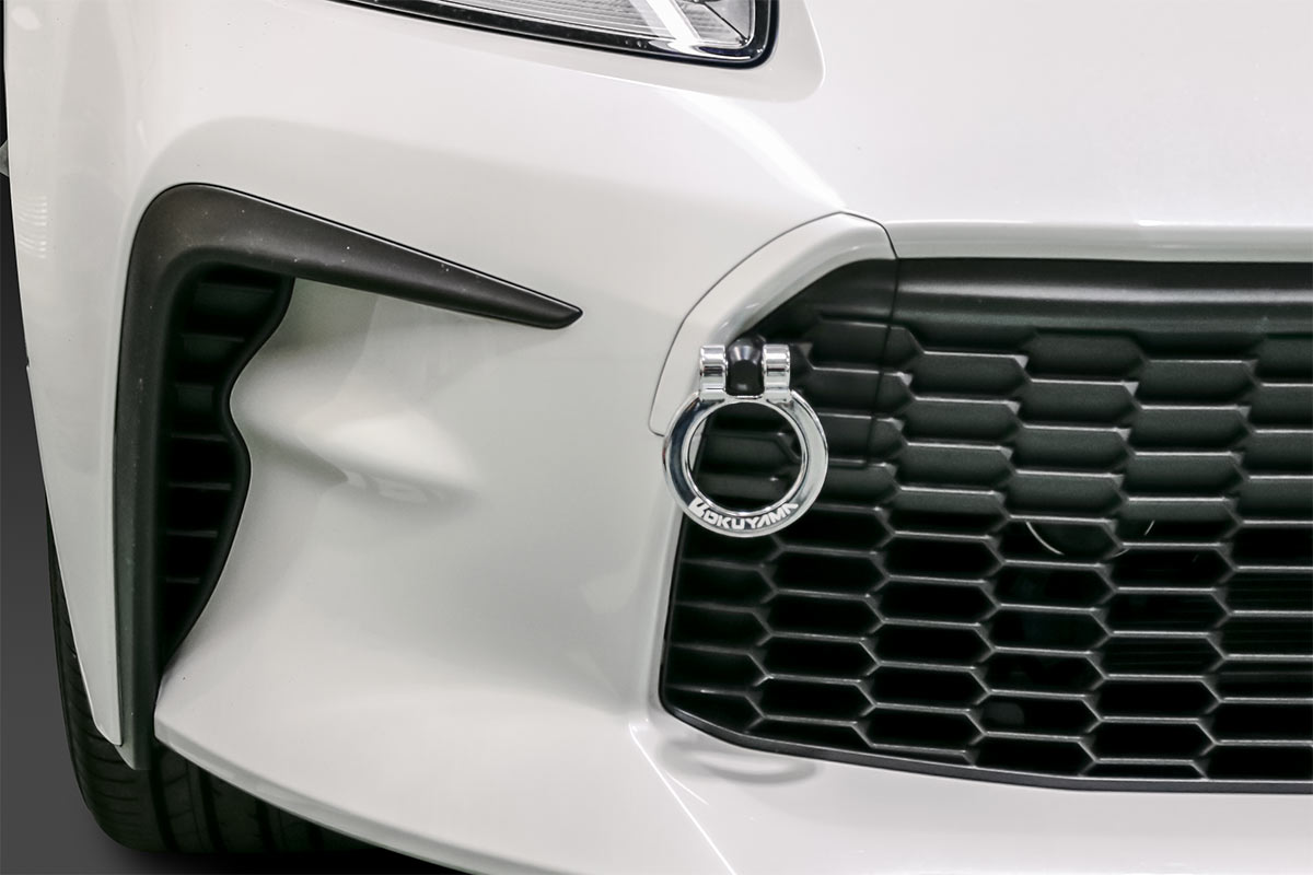 純正の牽引フック取付け穴へ装着するタイプのスチール製 首振りトーイングフック。折り曲げることで装着したままでも公道走行が可能です。