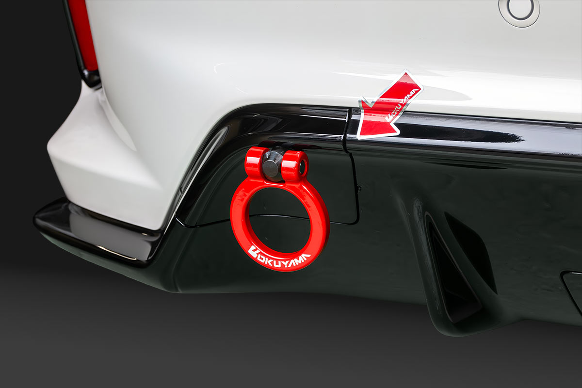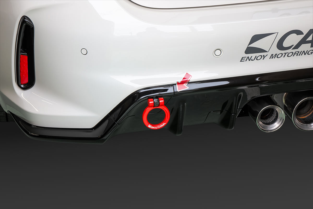 純正の牽引フック取付け穴へ装着するタイプのスチール製 首振りトーイングフック。 走行中に振動や風圧で車体側へ倒れてキズにならないようにプランジャーを採用し、工具を使わずに 0°/90°で固定ができるため、緊急時すぐにフック部を可動させる事ができます。