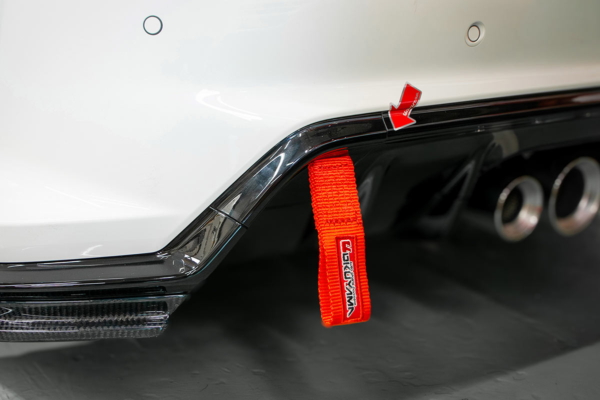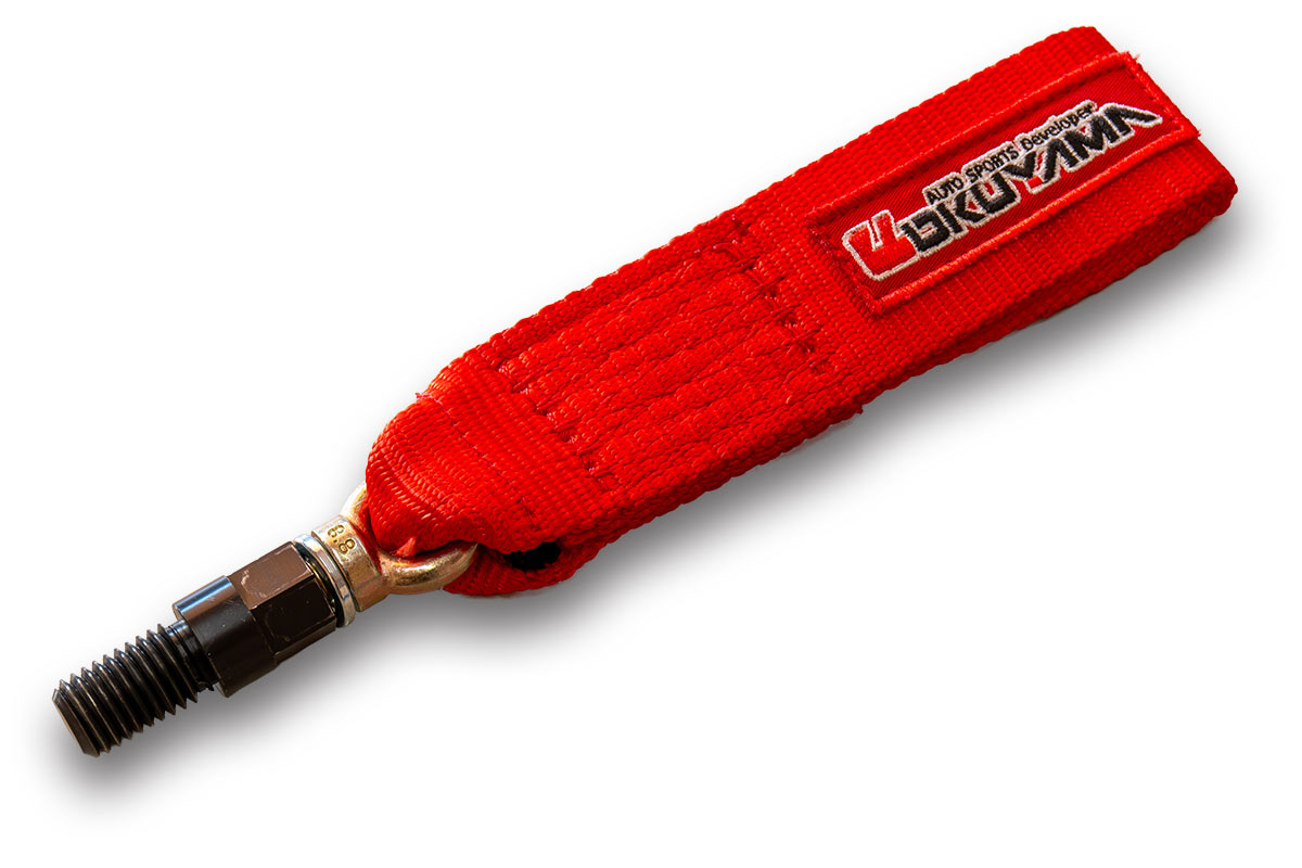 ベルトタイプの牽引フック。車種専用のロッド(アダプター)がセットになっているので、純正の牽引フック取付穴へボルトオン装着が可能です。